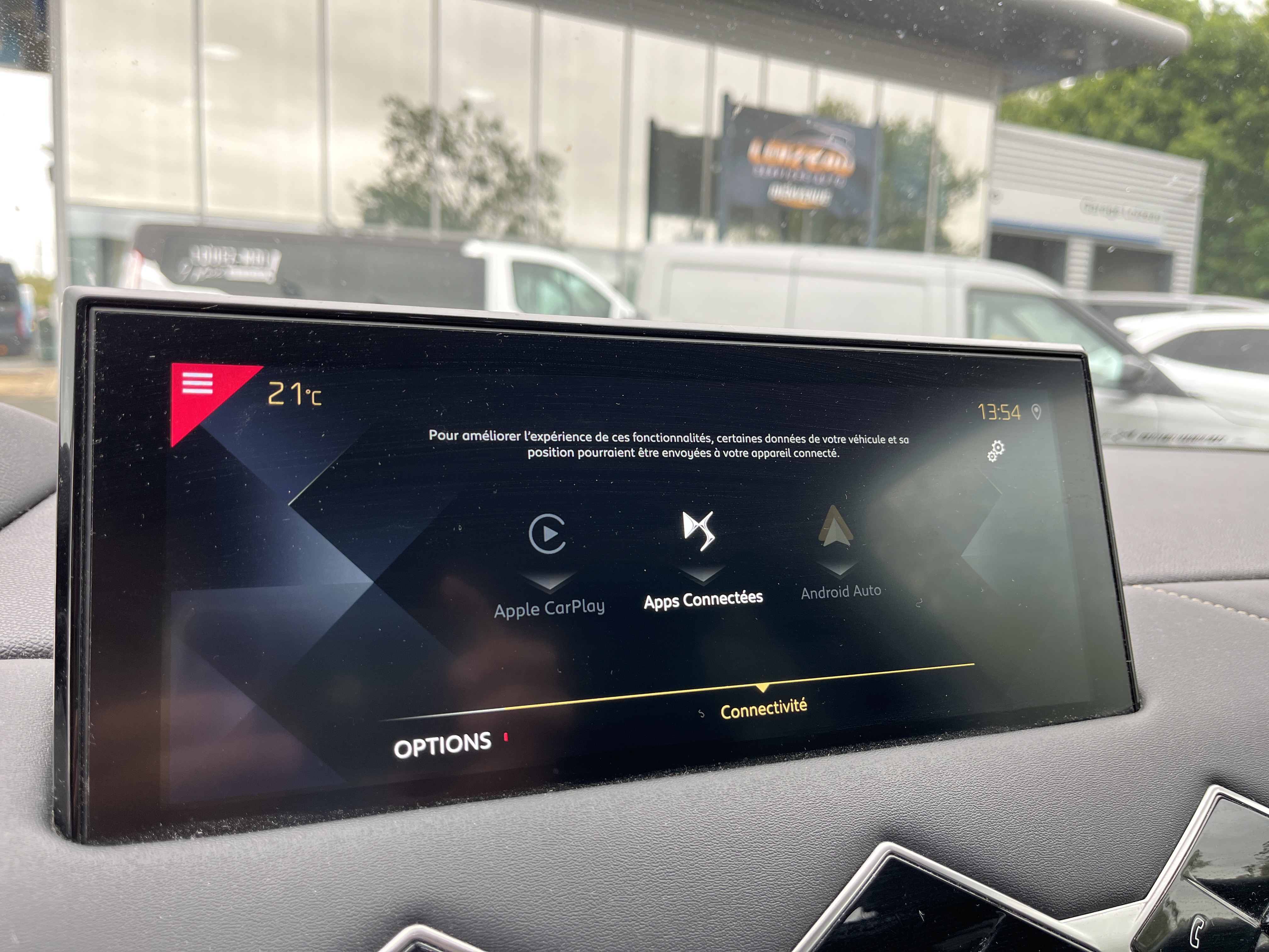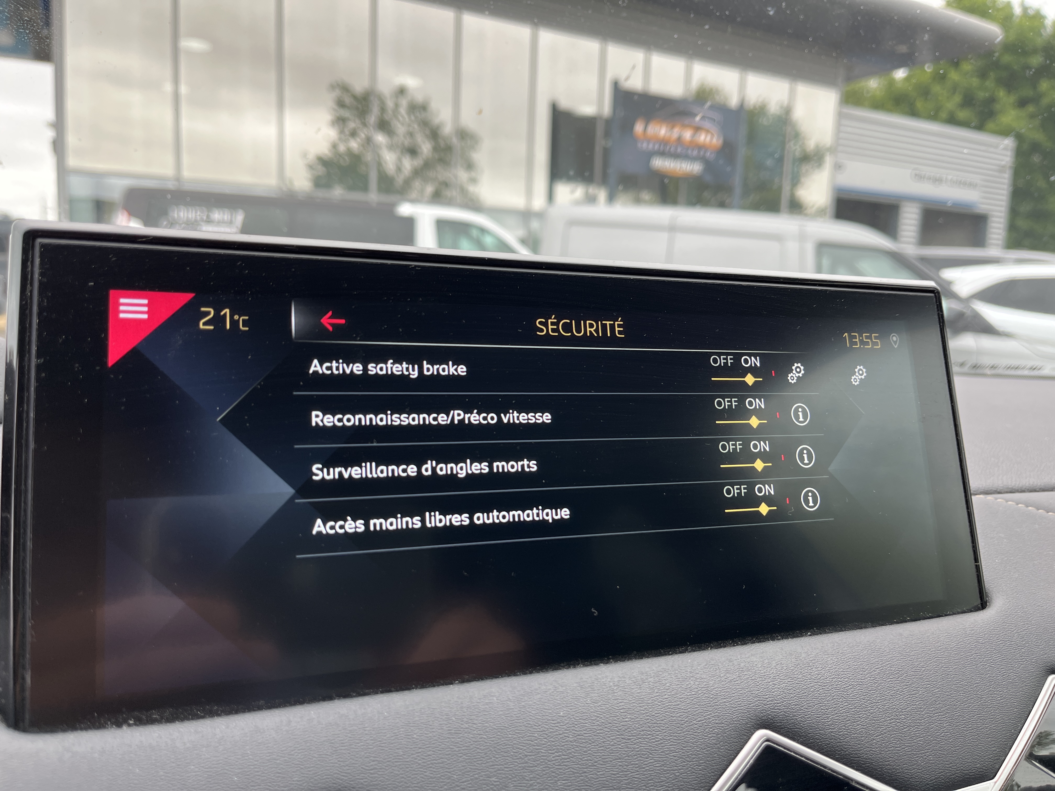 ABS, AFU, ESP, REFAccoudoir central AVADML PROXIMITY avec DS CONNECT BOXAide au demarrage en penteAide au stationnement AV et ARAirbags frontaux aux places AV avec desactivation par cle de l'airbag passagerAirbags lateraux de type "thorax" aux places AV et ARAlerte de franchissement involontaire de ligneAllumage automatique des pharesBanquette arriere modulable 2/3-1/3Chargeur sans filClimatisation automatiqueCombine numeriqueControle dynamique de stabilite (ESP) avec antipatinage des roues (ASR)Coques de retroviseurs exterieurs noir brillantDemarrage Mains-Libres avec bouton de demarrage a pulsationDetection de sous-gonflageDS CONNECT NAV avec Mirror Screen et radio numeriqueEclairage de boite a gants, d'accoudoir central AV et de coffre a LEDEcran tactile 10,3" HDEssuie-vitre AV a declenchement et cadencement automatiquesFeux diurnes a LEDFixations ISOFIX a la place passager AV et aux places laterales ARFrein de stationnement electriqueJantes alliage 17" MADRIDLeve-vitres AV/AR electriques, sequentiels et antipincementNavigation avec Mirror Screen et radio numeriquePalettes au volantPoignees de portes affleurantes ouverture a l'approcheReconnaissance des panneaux de vitesse et preconisationReconnaissance vocaleRegulateur/Limiteur de vitesseRetroviseurs exterieurs electriques, degivrants et rabattables electriquementRoue de secours galetteSelecteur de mode de conduiteVitres AR et lunette surteinteesVolant reglable en hauteur et profondeur