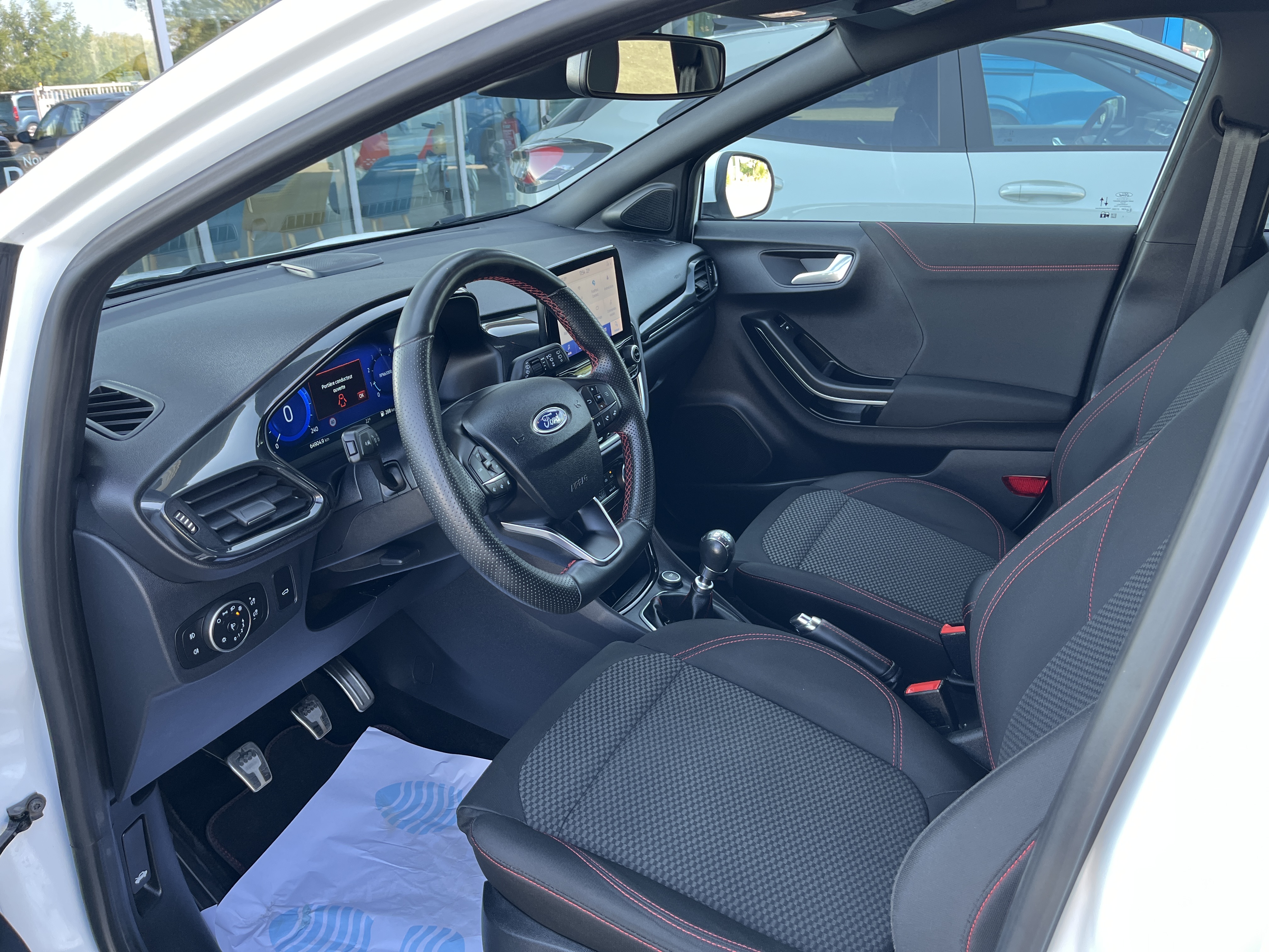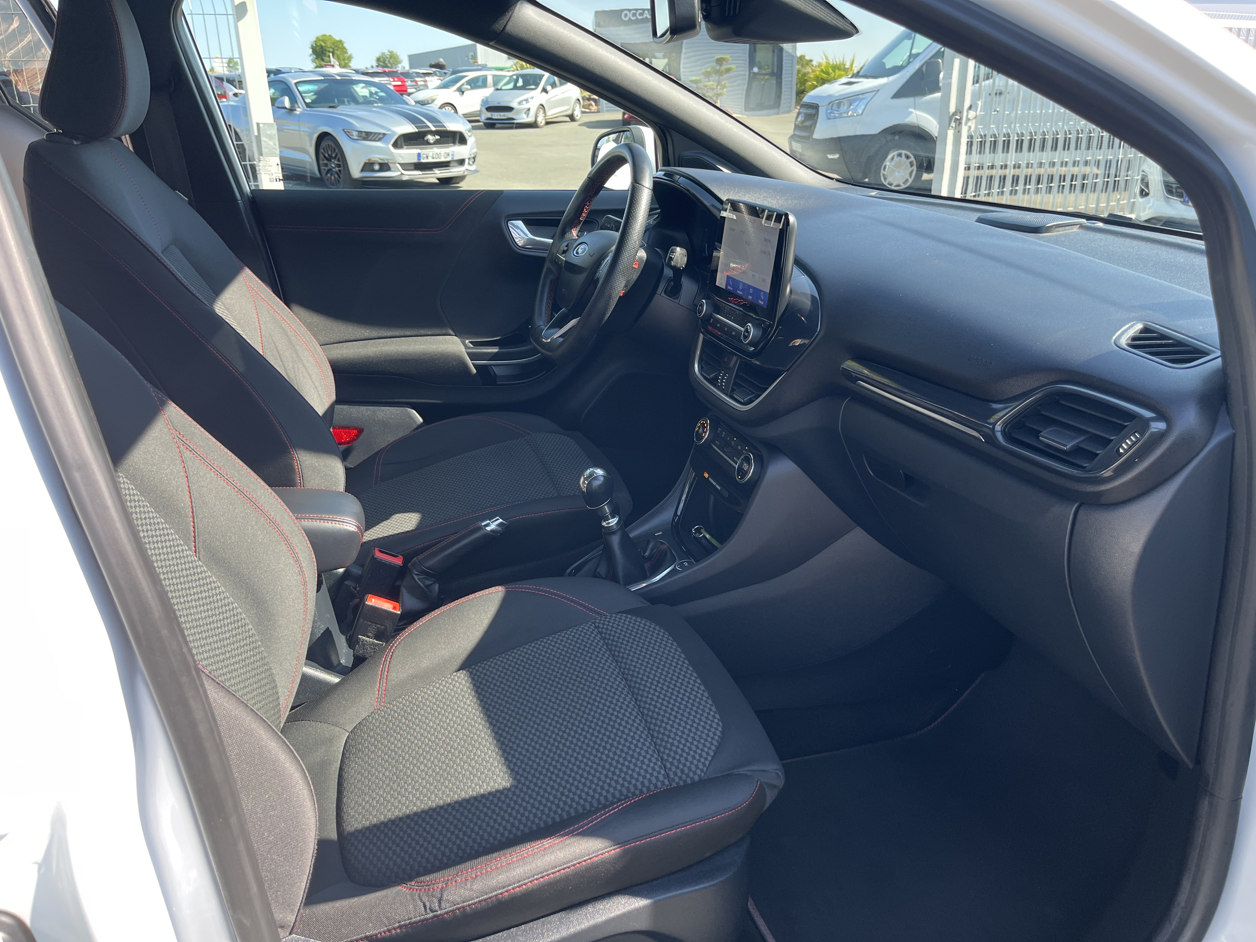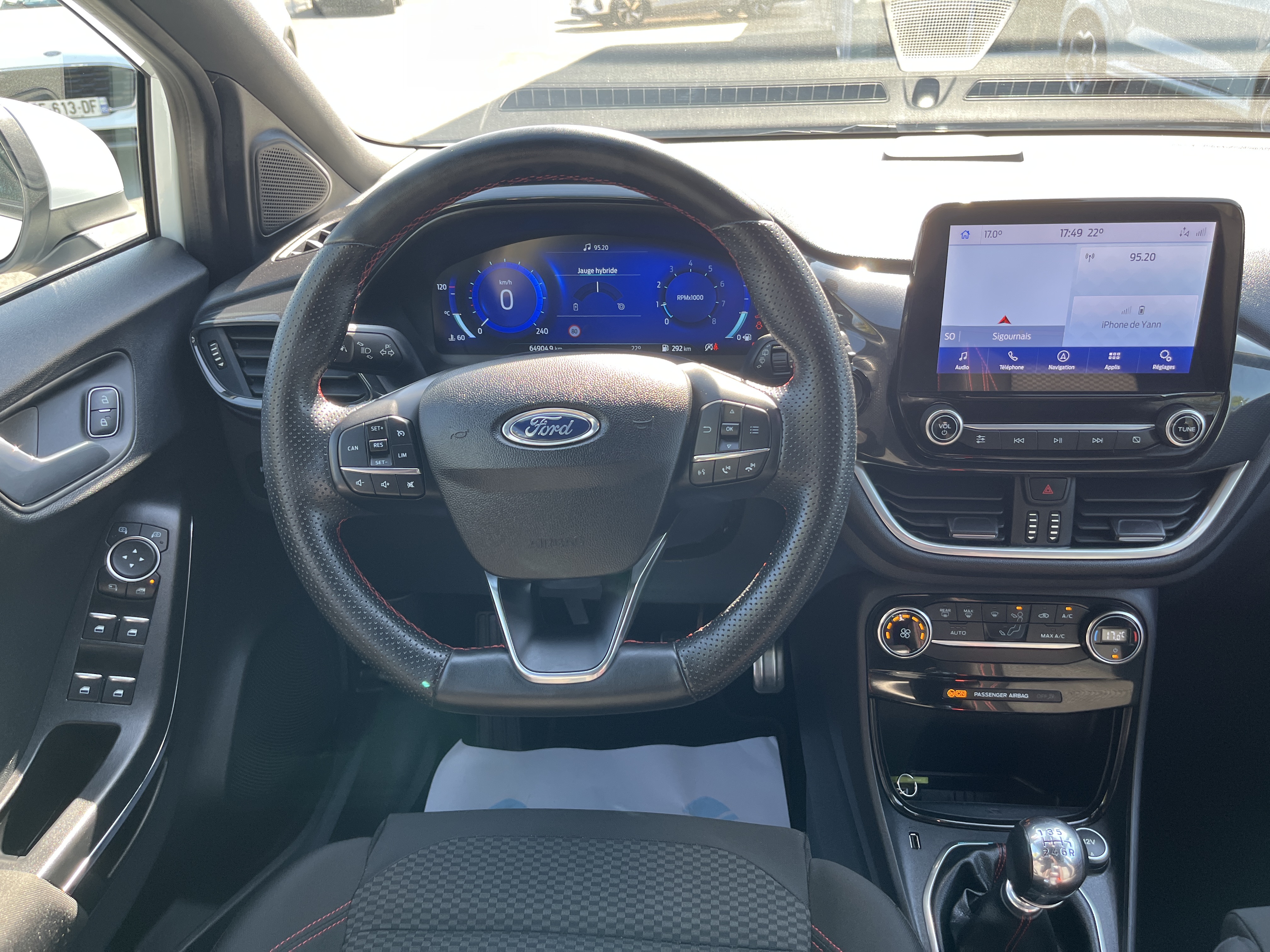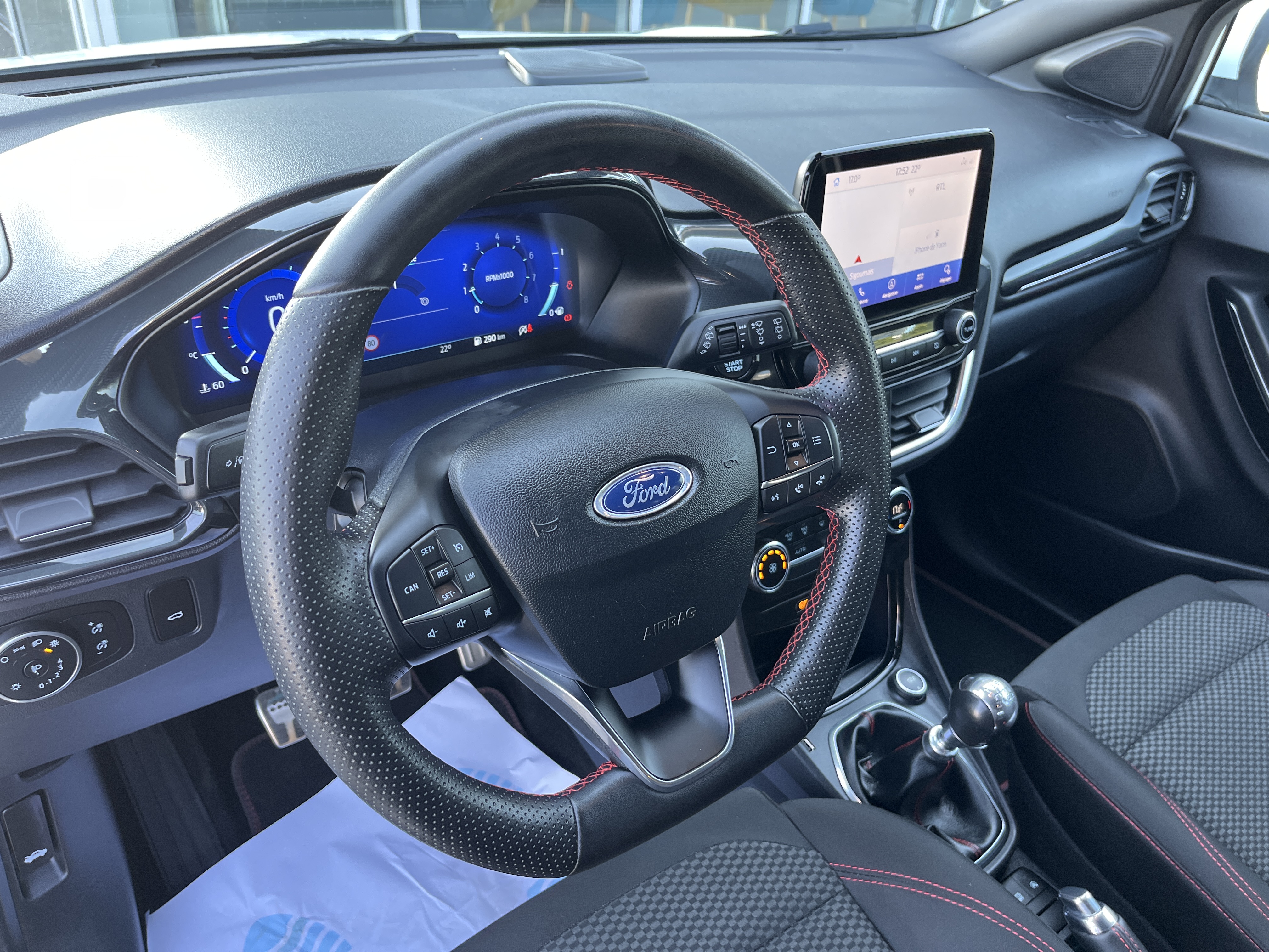 2 Fixations ISOFIX aux places AR5 Modes de conduite selectionnables (normal, eco, sport, faible adherence, trail)Aide au demarrage en coteAide au maintien dans la voie avec detection des bas-cotesAide au stationnement ARAlerte de franchissement involontaire de ligneAllumage automatique des feuxBadges exterieurs ST-LineBanquette AR rabattable 60/40Bouton de demarrage "Ford Power"Combine d'instrumentalisation numerique 12.3" avec EcomodeCorrecteur electronique de trajectoire (ESP)Eclairage d'ambiance interieurEnvironnement noirFeux AR a LEDFeux de jour a LEDFeux de route intelligents - Commutation automatique des feux de route aux feux de croisementGrille de calandre ST-LineJantes alliage 17" 5x2 branches finition Black Machined (pour pneus toutes saisons 215/55 R17)Kit de carrosserie ST-LineKit de reparation pneumatiqueLimiteur de vitesse intelligent (affichage instantane des limitations de vitesse sur le tableau dePedalier AluminiumPhares antibrouillard AV avec fonction eclairage des anglesPlancher de coffre ajustablePlaques de seuil de portes AV ST-LineRecharge de telephone par inductionReconnaissance des panneaux de signalisationRegulateur de vitesseRetroviseurs exterieurs couleur carrosserie electriques, degivrants et rabattables electriquementSellerie tissu noir Court avec surpiqures rougesSysteme audio Ford SYNC3 avec ecran tactile 8", commandes vocales, 2 ports USB, alerte contresens,Systeme de navigation Europe et points d'interets MichelinSysteme de prevention de collision avec freinage post-collision et detection pietonsSysteme de surveillance de la pression des pneusTrappe Easy FuelVerrouillage centralise a distanceVitres AV/AR electriques a impulsion haut/basVolant a meplat 3 branches ST-Line avec surpiqures rougesFonction Apple Carplay & Androïd Auto
